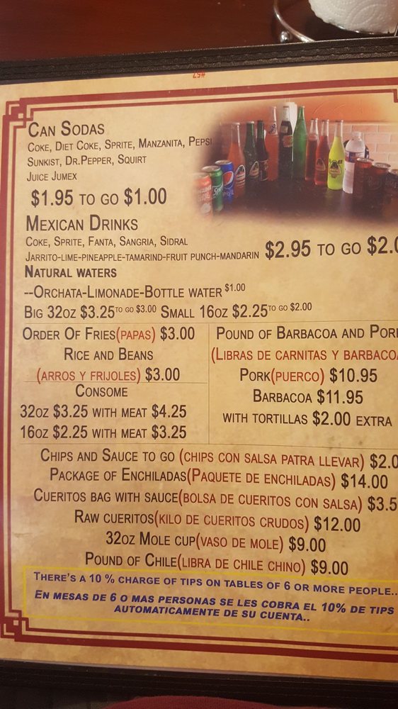 The menu showcases a blend of classic tastes, making it an ideal spot for groups and families. With options for takeout and a welcoming ambiance, it's perfect for a casual meal out or a quick bite. Pair your meal with refreshing beverages like Jarritos Mexicana or traditional aguas frescas to elevate the experience.